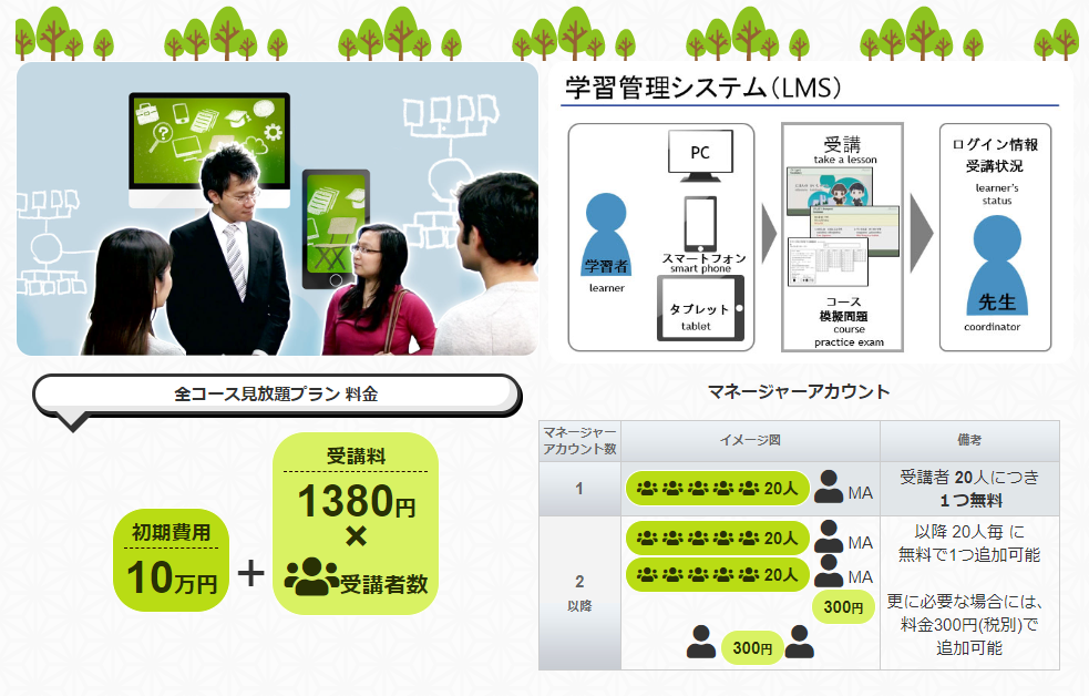 外国人スタッフの日本語教育にご活用いただけます。さらに、LMS(学習管理システム)をセットアップすれば、受講者(社員)の受講状況をチェックできます。PCからだけではなくiPhone/iPad、などからも利用可能です。